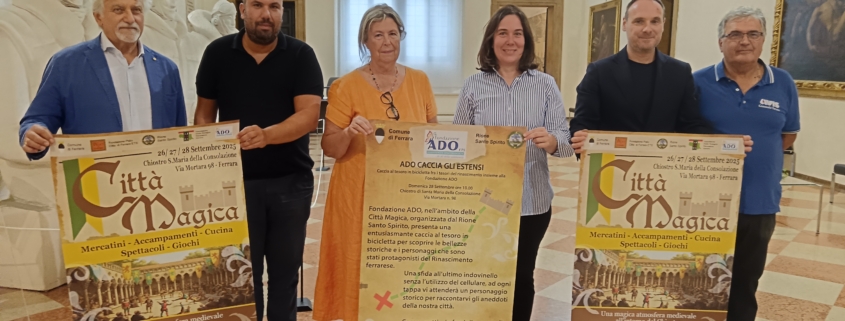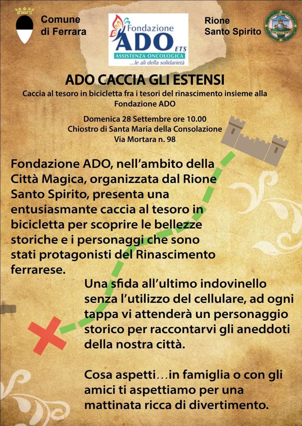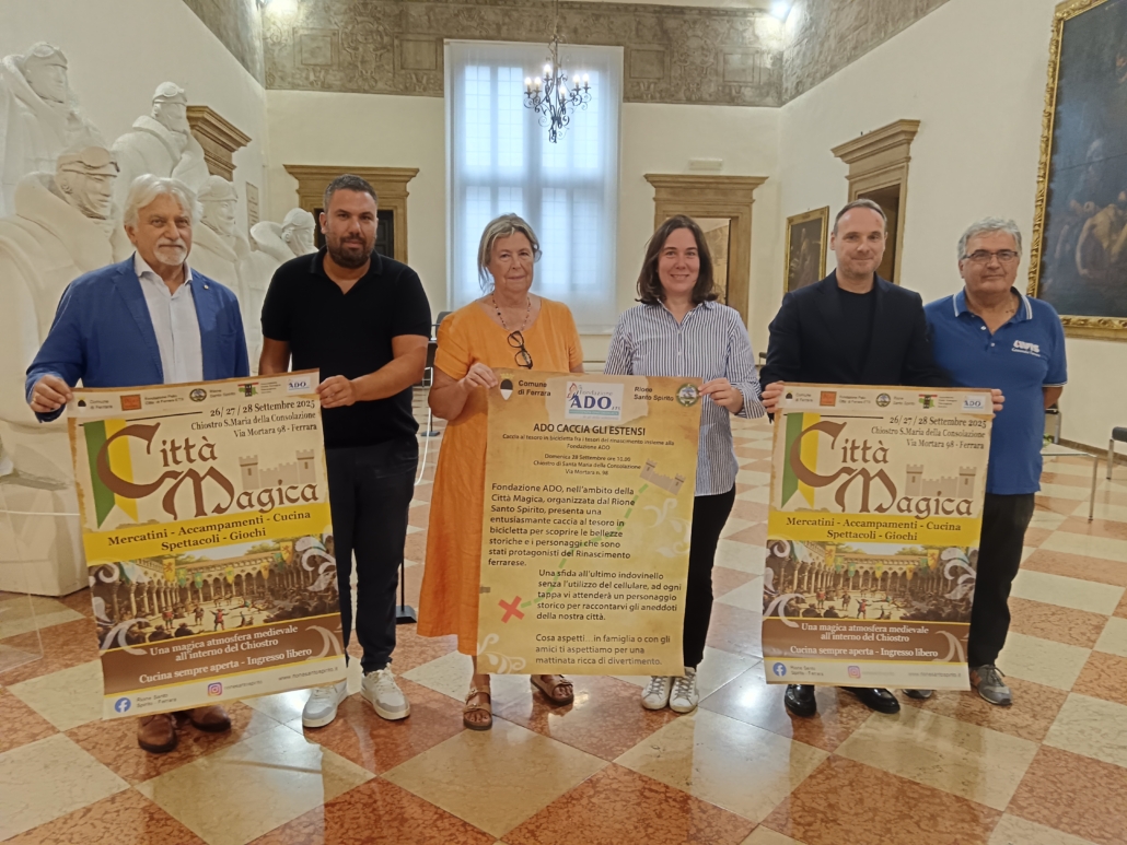 – domenica 28 alle ore 10 appuntamento con “Ado caccia gli Estensi”, una caccia al tesoro in bicicletta organizzata insieme alla Fondazione Ado “per scoprire, attraverso curiosi indovinelli, i monumenti storici della città e i personaggi e i segreti che in qualche modo li hanno abitati – come ha spiegato Sabina Mirabella, consigliera dell’Associazione – si parte dal e si torna nel Chiostro. Per iscriversi e partecipare anche al pranzo: Fondazione Ado 0532 972400 oppure ufficio.iniziative@adohtf.it”