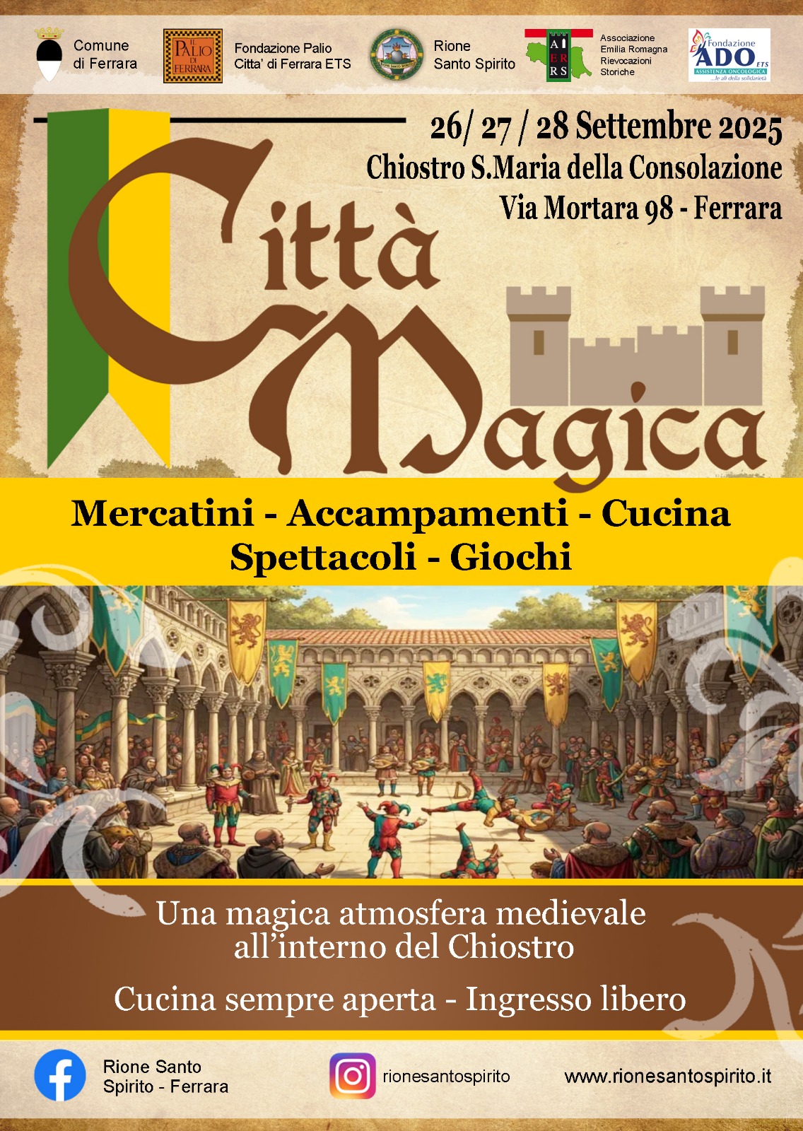 Dopo una lunga pausa lo scorso anno la Città Magica è tornata riempiendo di spettacoli e profumi il Parco Massari. Quest’anno però il villaggio rinascimentale della nostra contrada si può dire che ritrovi casa: da venerdì 26 a domenica 28 settembre a ospitarlo sarà il Chiostro di Santa Maria della Consolazione, sede del rione stesso.